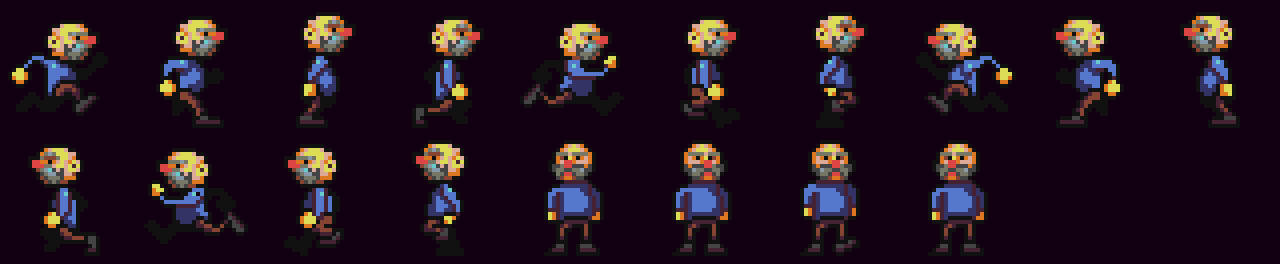 Jede einzelne dieser Szenen (Rechts laufen, links laufen, herum stehen) besteht aus einer Reihe von Einzelbildern. Spielt man diese mit einer ausreichenden Geschwindigkeit hintereinander ab, entsteht der Eindruck einer fließenden Bewegung. Nur dass ein ™REDPILL Film aus vielen Filmrollen (also Spritesheet-Bildern) besteht.