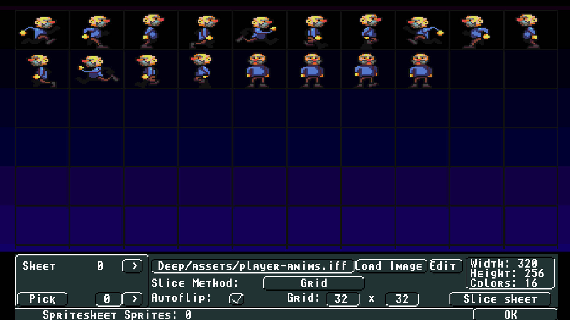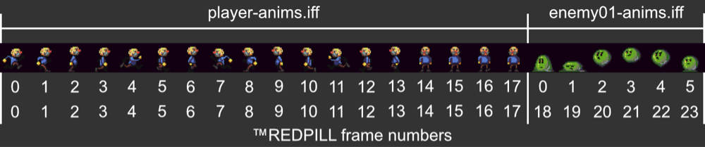 All diese Einzelbilder der Animation müssen sich in einem einzelen Bild befinden. Nun muss man aber wissen dass es, meiner Erfahrung nach, schwierig ist ™REDPILL dazu zu überreden Bilder zu laden die größer sind als 320x256 Pixel. Das Readme sagt etwas anderes, aber das scheint nicht zu funktionieren. Wenn Du da mehr wissen solltest: Immer her mit den Infos! So ein 320x256 Bild ist recht winzig, selbst für AMIGA-Verhältnisse. Wenn Dein Spieler 32x32 Pixel groß ist, bleiben gerade einmal 80 Bilder für alle Frames aller Animationen eines Objekts. Das Spritesheet startet also mit dem Frame 0 und endet mit der lauschigen 79. Aber was ist wenn Du schon alle Frames für Deine Spielfigur verbraten hast und Deine Gegner noch gar keine Grafik haben? Nun, dann benötigst Du ein zweites Spritesheet und hier beginnt der Ärger. Kommen wir zurück zum Keks und dem Dilemma: