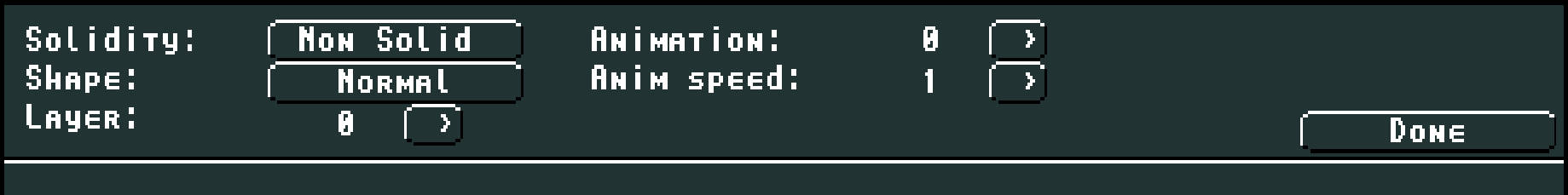 In diesem Bereich haben wir erneut, wie im Level-Editing, die Möglichkeit im oberen Bildschirmbereich ein Tile auszuwählen und dann im unteren Bereich (den Du hier im Screenshot siehst) die Eigenschaften dieses Tiles festzulegen. Besonders zu beachten ist hier der Button, welcher mit "Non Solid" beschriftet ist. In ™REDPILL ist jedes Tile vom Start weg erst einmal ohne Kollision ausgestattet. Das ist auch der Grund warum unser Player derzeit einfach durch die Map fällt. Wählen wir nun ein Tile in unserem Tileset aus und klicken auf den Button "Non Solid", wechselt der Button zunächst zur Beschriftung "Platform" und auch die Anzeige des ausgewählten Tiles ändert sich. Noch ein Klick auf den Button und die Beschriftung wechselt zu "Solid" und auch die Anzeige des ausgewählten Tiles ändert sich erneut. Aber was ist denn der Unterschied zwischen "Non Solid", "Platform" und "Solid"?